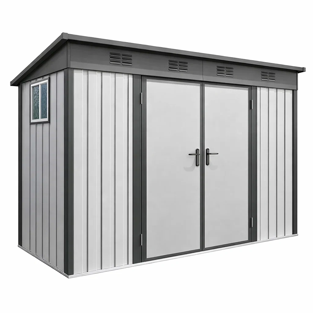 Abri de jardin en métal gris avec portes coulissantes
